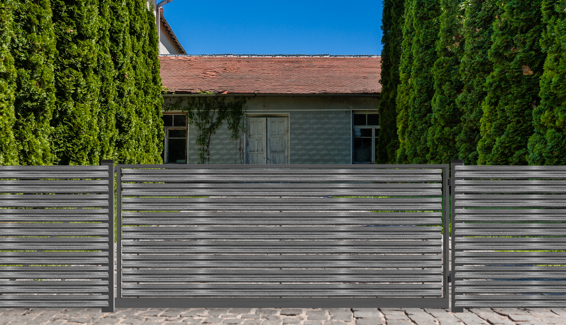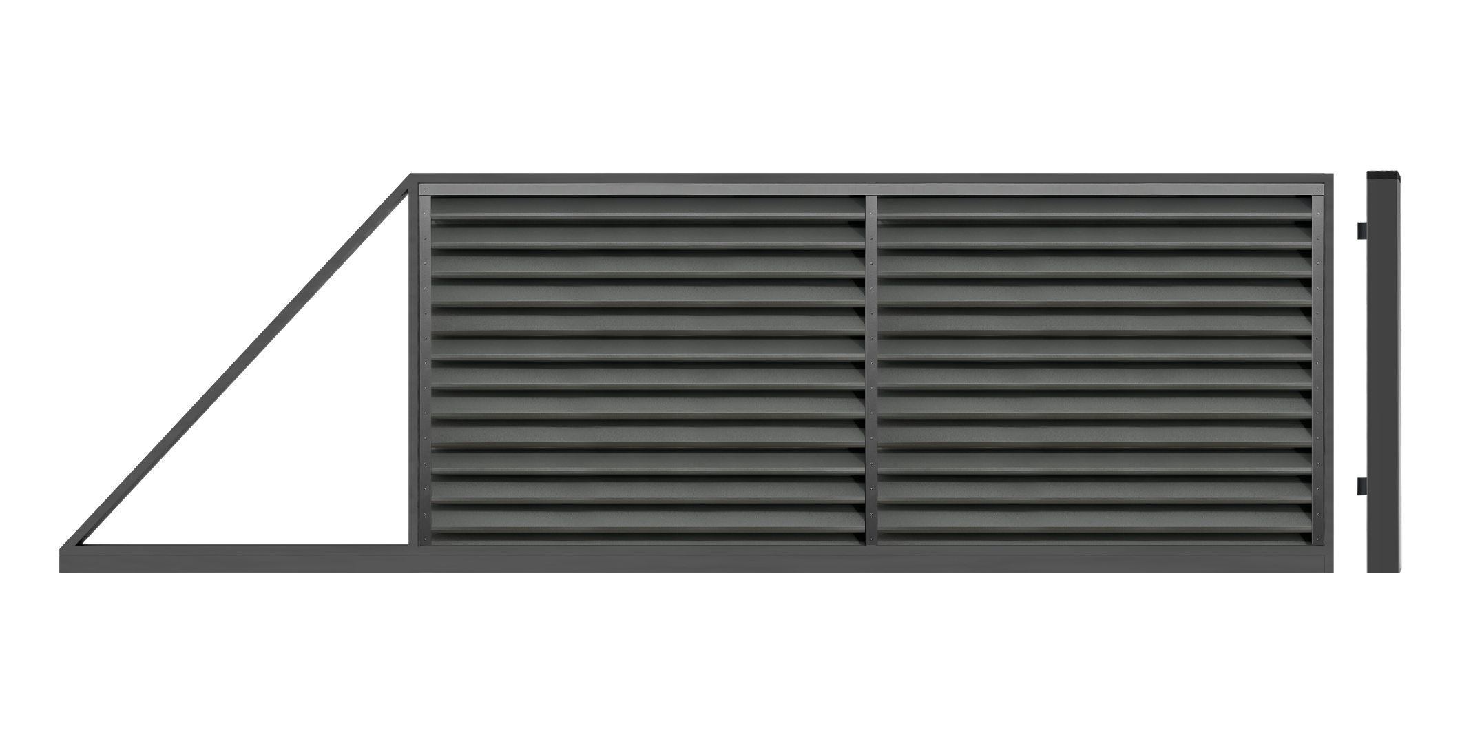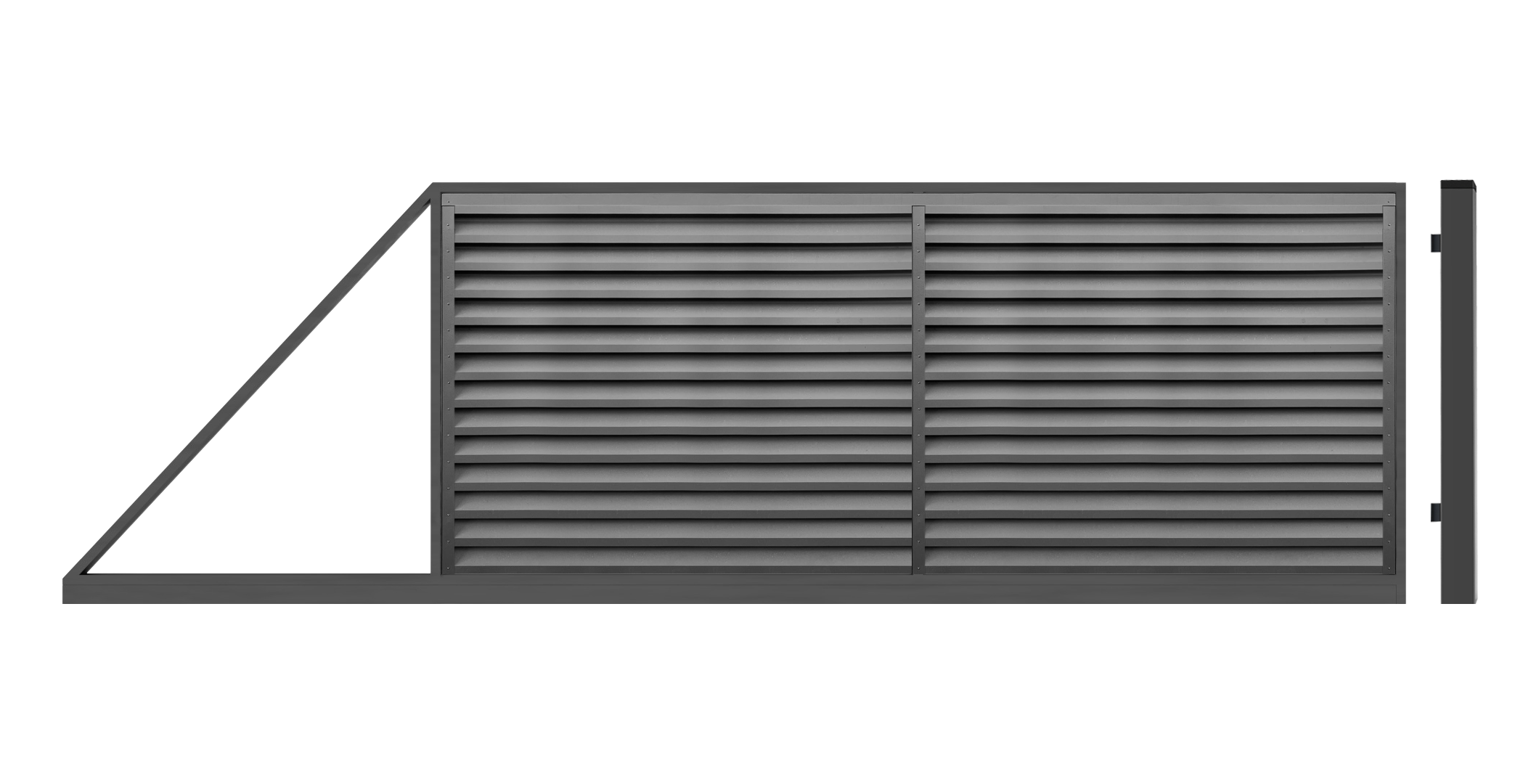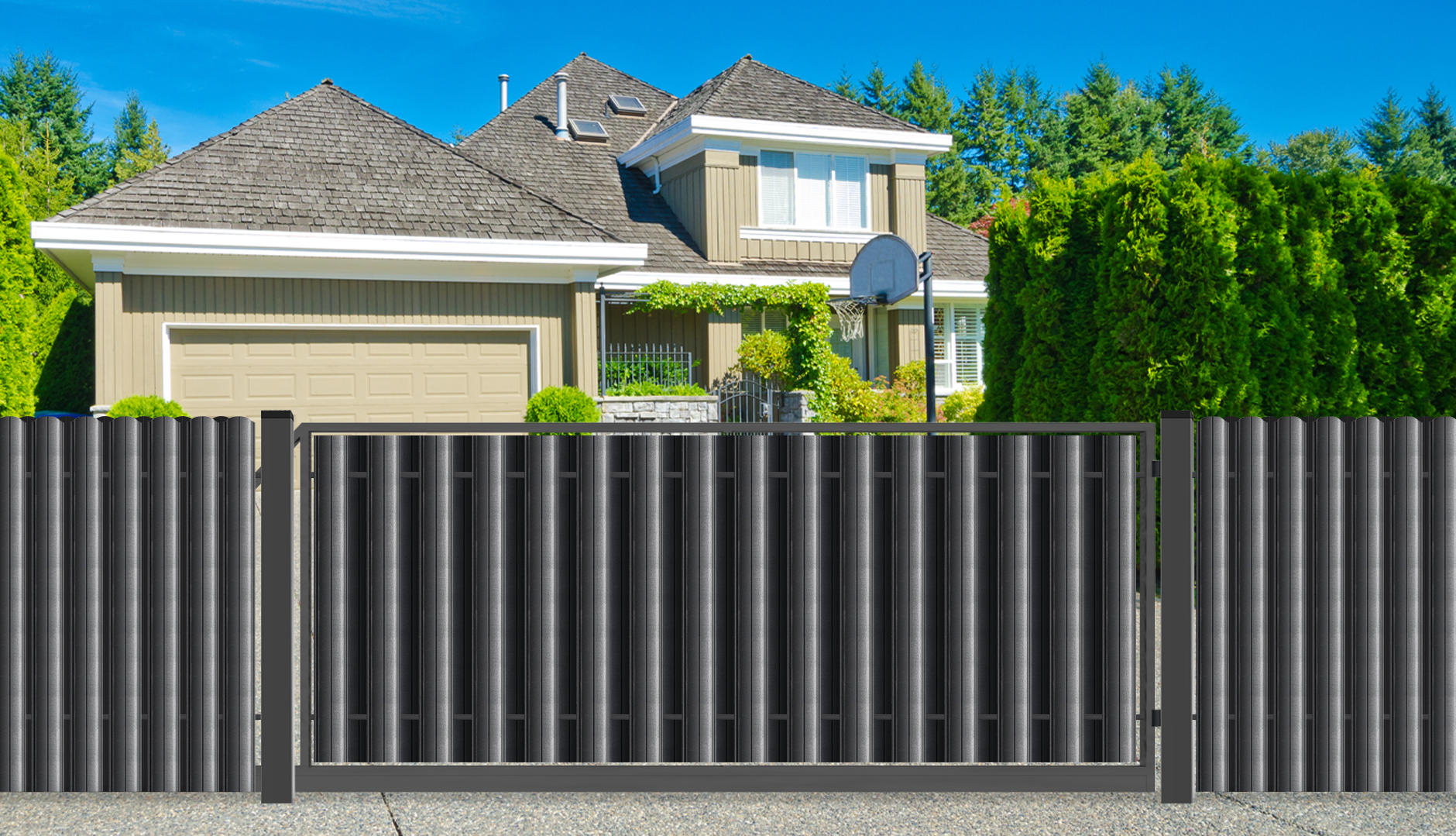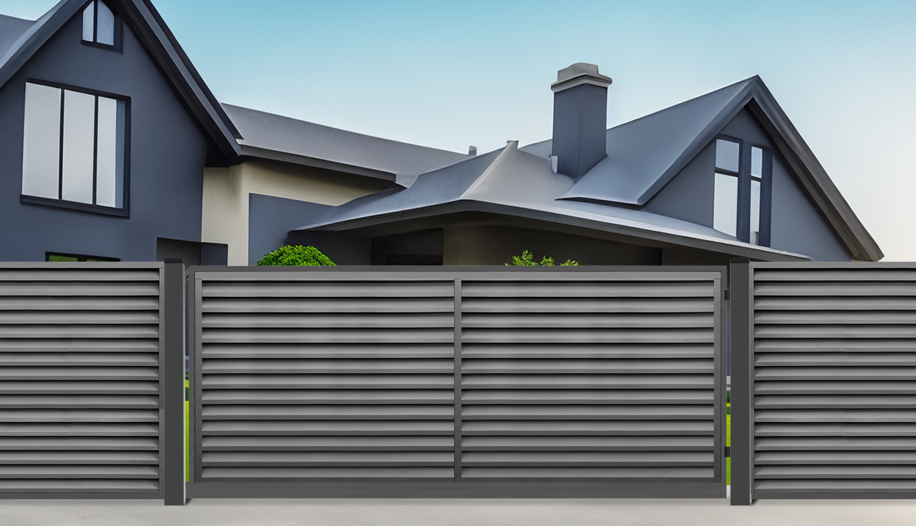 You can also order modern cantilever driveway gate with remote control from us. The gate frame is a welded structure, powder coated and filled with Picket(vertical or horizontal) or Louvered fence type. Driveway gates are available in seven standart colors and can be purchased in standard or custom sizes. FERRO system also provide installation for all our products.